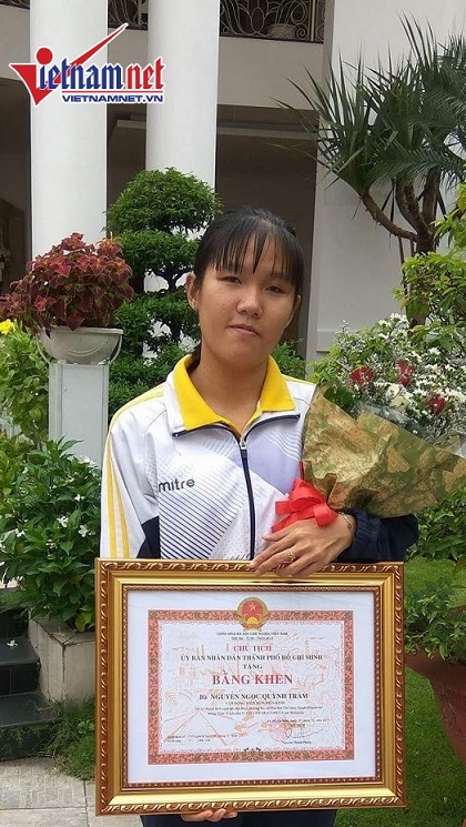 | Chủ tịch UBND TPHCM trao tặng bằng khen cho Quỳnh Trâm. (Ảnh: Nguồn Internet) |