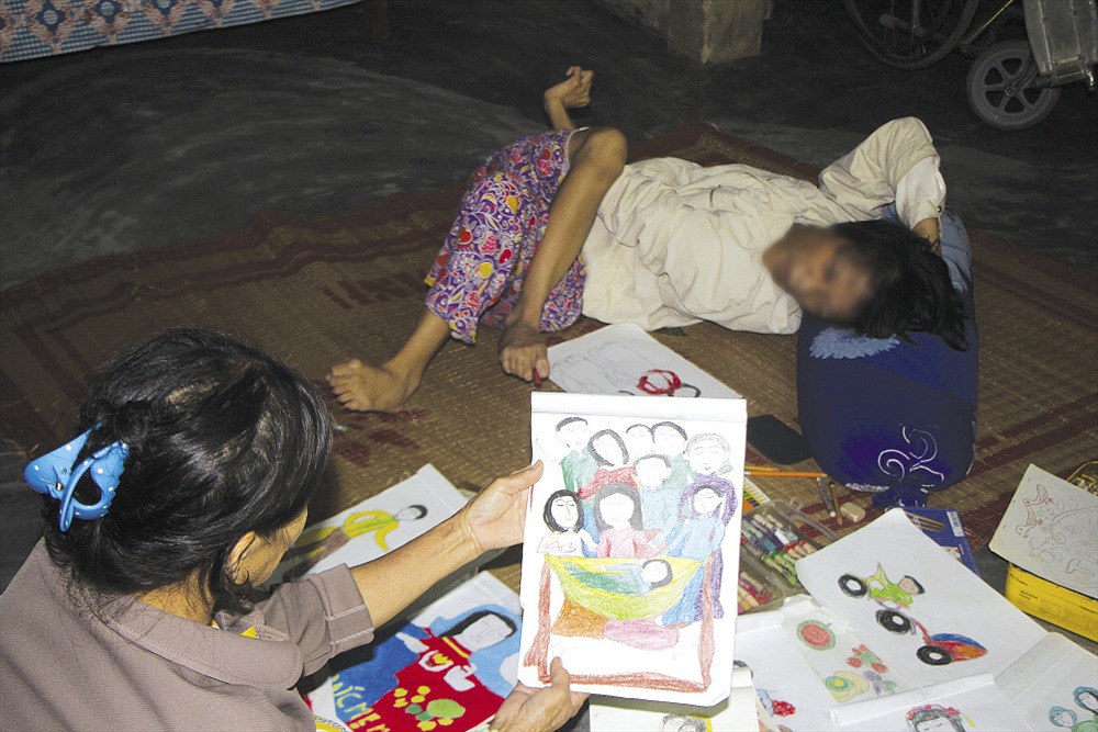 Hôm tôi đến, em đang nằm giữa nhà, xung quanh đầy tranh vẽ còn dang dở và bút màu. “Nó thích nên ăn uống xong là bắt tui soạn dụng cụ ra để vẽ”- bà Liên giải thích cho ánh mắt đầy tò mò của tôi.