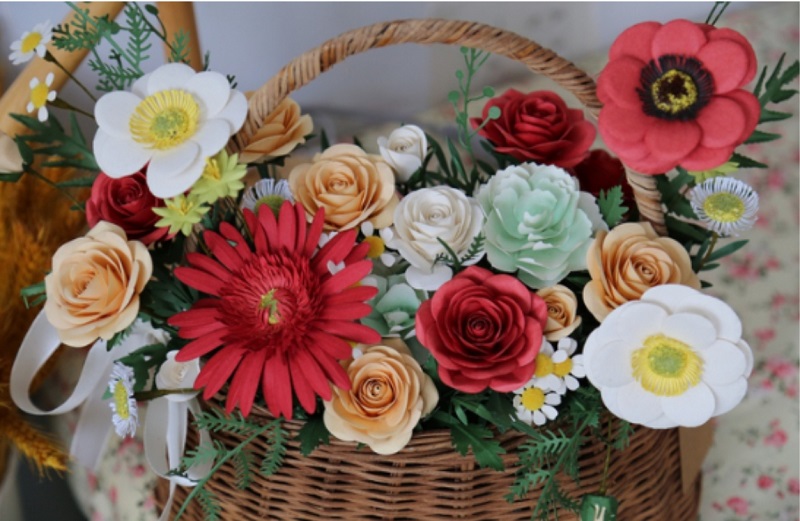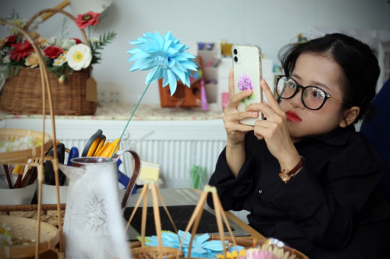 Từ những tấm giấy đơn điệu, Trang mày mò làm ra những bông hoa xinh xắn, đa dạng màu sắc. Nếu chưa từng thấy Trang làm, hẳn ít ai ngờ rằng đó là sản phẩm được tạo nên từ một cô gái bị bệnh xương thủy tinh bẩm sinh. Trong lúc trò chuyện cùng chúng tôi, Thùy Trang vẫn miệt mài, tỉ mẩn để cắt dán những cánh hoa nhỏ để hoàn thành sản phẩm.