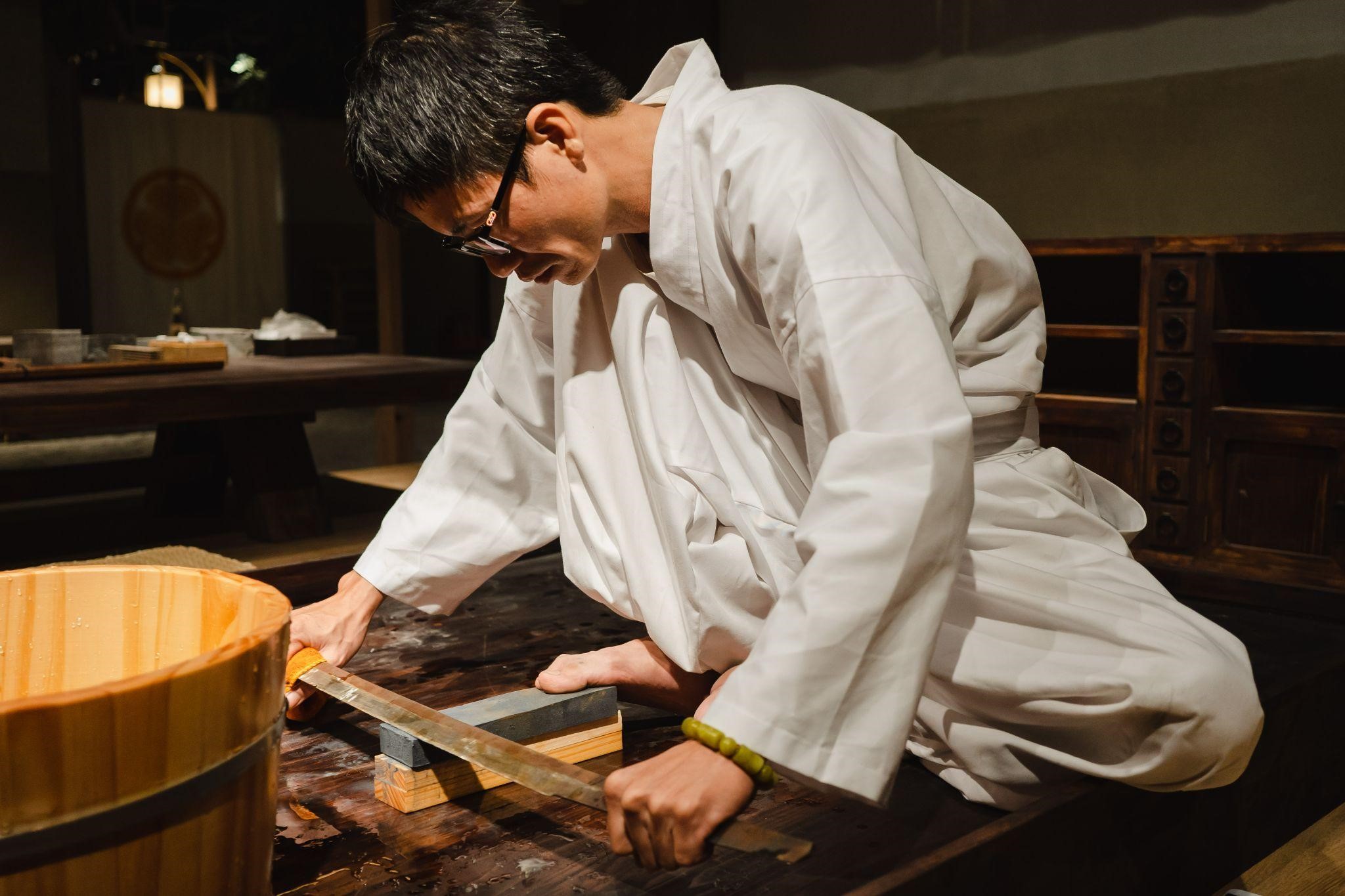 Quầy mài kiếm, nơi kiếm được nghệ nhân mài sắc qua 12 loại đá mài. Công đoạn này được gọi là "togi", đòi hỏi độ chính xác và kỹ năng đặc biệt của nghệ nhân làm kiếm.
