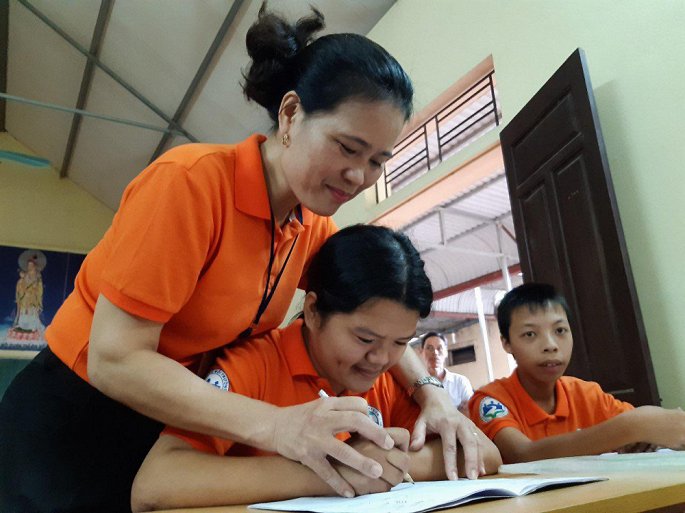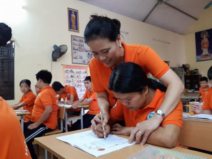 | Cô giáo Lê Thị Hòa ngày ngày miệt mài uốn nắn từng nét chữ cho trẻ khuyết tật đặc biệt suốt 26 năm qua. |