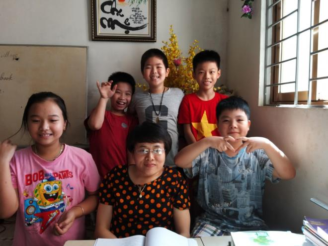 Chị Lê Thị Lan Anh cùng các học sinh tại lớp học tiếng Anh của mình.