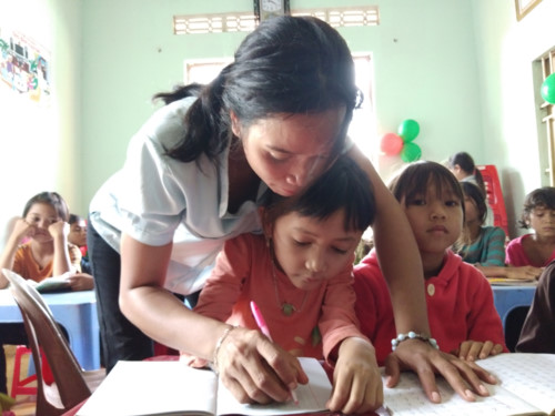 | Cô H’Blao tận tình chỉ dạy cho các em từng cách đọc cách viết |