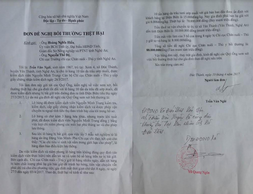 Sau khi được trao trả lô hàng, ngày 10/4/2017, ông Trần Văn Ngãi, chủ lô hàng đã có đơn đề nghị bồi thường thiệt hại gửi giám đốc Sở NN&PTNT tỉnh Nghệ An và Chi cục CN-TY tỉnh Nghệ An. Theo nội dung đơn, ông Ngãi cho rằng, do lô hàng bị giữ lâu ngày, trong đó có 4 ngày để ngoài trời nên sản phẩm phải xử lý sơ chế lại. Vì vậy, giá bán 1 kg da trâu muối bị giảm từ 15 ngàn đồng/kg xuống còn 8 ngàn đồng/kg. Tiền thuê chiếc xe tải 27C-007.87 chở lô hàng phải thanh toán là 10 triệu đồng. Tiền thiệt hại do 3 lao động chính của gia đình ông Ngãi phải nghỉ việc, chờ đợi, đi lại để giải quyết vụ việc 8 ngày là 8 triệu đồng. Tổng thiệt hại thực tế được ông Ngãi nêu trong đơn là 88 triệu đồng.