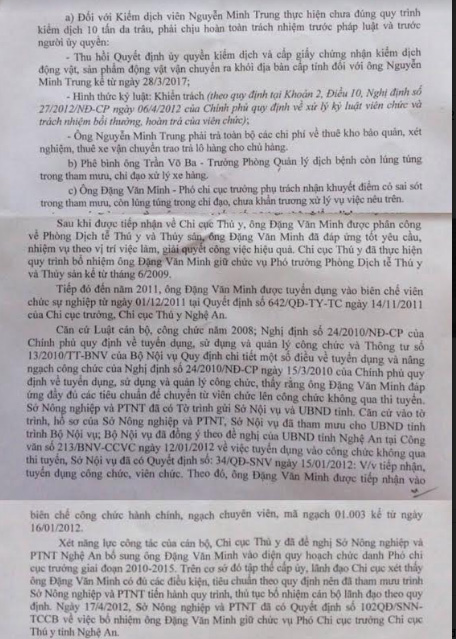 Mặc dù trong báo cáo giải trình của Sở NN&PTNT tỉnh Nghệ An có nêu hình thức kỷ luật của 3 cá nhân liên quan đến quy trình xử lý lô hàng, nhưng ông Đặng Văn Minh- Phó Chi cục trưởng Chi cục CN-TY tỉnh Nghệ An (là người trực tiếp chỉ đạo công tác kiểm dịch, xử lý sai phạm về lo hàng không đúng quy định theo Thông tư số 25/2016/TT-BNNPTNT) chỉ nhận “khuyết điểm có sai sót trong tham mưu, còn lúng túng trong chỉ đạo, chưa khẩn trương xử lý vụ việc”. Ông Trần Võ Ba chỉ bị “phê bình” do “còn lúng túng trong tham mưu, chỉ đạo xử lý xe hàng”.