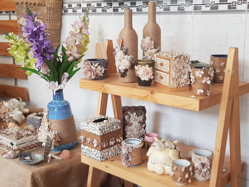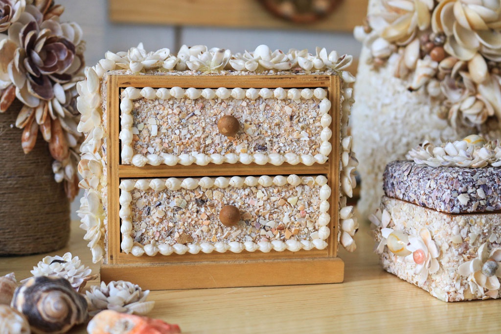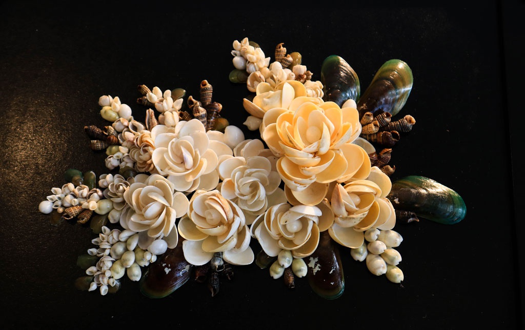 7 năm gán bó với những vỏ ốc đa dạng, chị Hiếu cho ra đời hơn 1.000 tác phẩm tranh ốc và các sản phẩm làm từ vỏ ốc các loại như bình hoa, hộp đựng bút, hộp nữ trang, hoa cưới, cài tóc, vòng tay, khung ảnh… Chị còn dùng ốc để trang trí đồng hồ, heo đất.