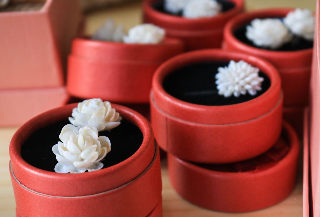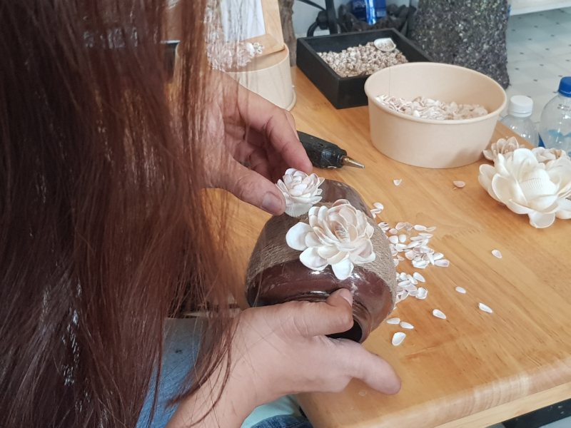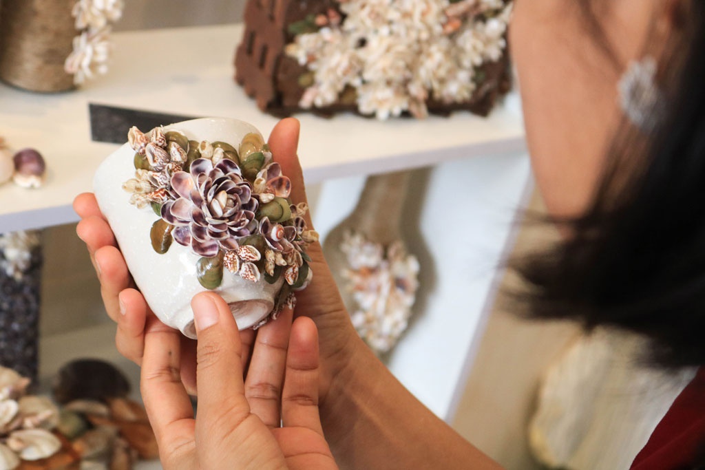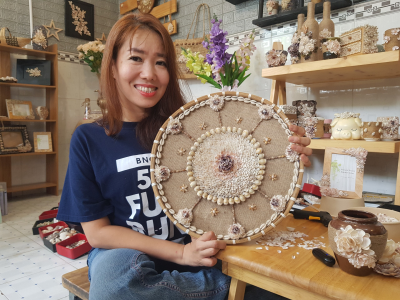Về nguồn nguyên vật liệu vỏ ốc, chị thường chọn những vỏ ốc được sóng biển trôi dạt vào bờ và nhờ những người dân gom lại bán cho mình, qua đó cũng tạo được thu nhập cho những người dân sống ven biển. Sau khi mang về, các loại vỏ ốc được làm sạch và không dùng hóa chất để tạo màu hay tẩy trắng vì chị muốn giữ nguyên màu sắc của chúng.