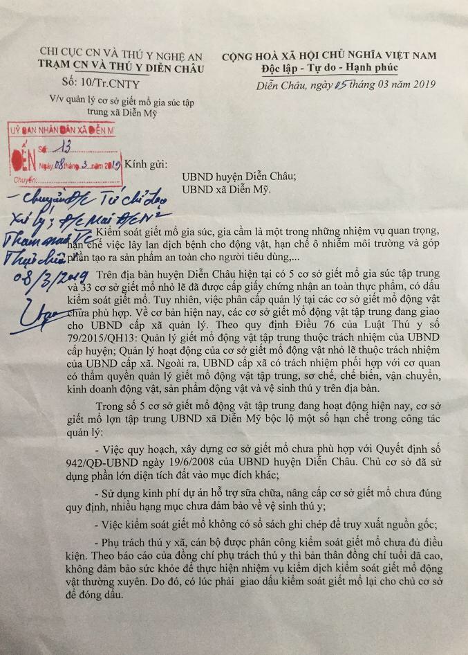Công văn của trạm Chăn nuôi - Thú y huyện Diễn Châu gửi Chủ tịch UBND huyện về tình trạng buông lỏng quản lý kiểm soát dịch bệnh tại xã Diễn Mỹ