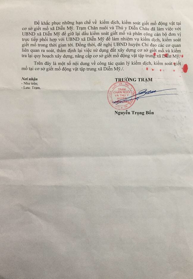 Nhận được tin báo, 14 giờ ngày 28/02/2019 cán bộ của Trạm Chăn nuôi - Thú ý huyện Diễn Châu đã điện thoại cho ông Thưởng (cán bộ thú ý xã Diễn Mỹ) mang con dấu lên để kiểm tra. Vào thời điểm cán bộ của trạm Chăn nuôi - Thú y huyện Diễn Châu điện thoại và đưa ra yêu cầu trên, ông Thưởng đang bận đi ăn cỗ cưới ở xã nên đã nhờ… ông Mạnh (chủ cơ sở giết mổ) lên nộp hộ. Xác định rõ nguồn tin báo của người dân là có cơ sở, để chấn chỉnh và ngăn chặn việc sử dụng con dấu tùy tiện, trái quy định, ông Nguyễn Trọng Bốn - Trạm trưởng Trạm Chăn nuôi - Thú y huyện Diễn Châu đã quyết định chuyển con dấu “KSGM” (lâu nay Trạm Chăn nuôi và Thú y huyện giao cho ông Thưởng quản lý) cho cán bộ Trạm Chăn nuôi và Thú y huyện Diễn Châu thực hiện kiểm soát giết mổ trong thời gian chờ làm rõ nguyên nhân xẩy ra sự việc trên.