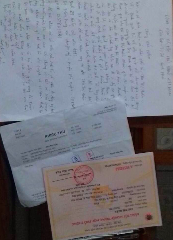 | Bằng tốt nghiệp THPT giả, phiếu thu tiền của chị Huần, được cán bộ tuyển dung công ty CP TMS “xin” lại khi hoàn trả lại tiền ngày 11/7/2016 |