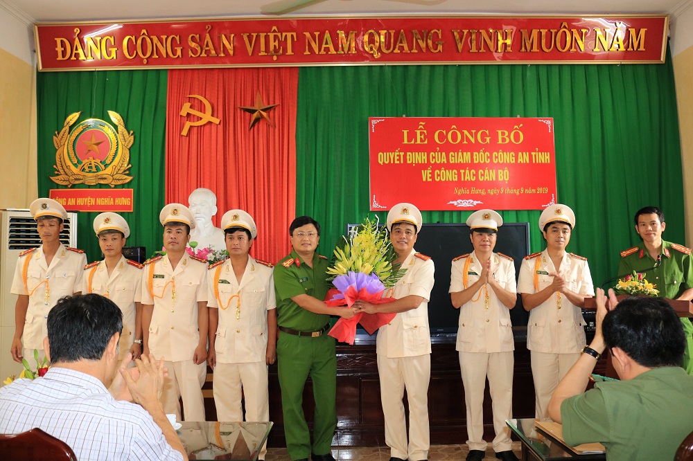 | Đ/c Thượng tá Lê Nam Anh, Trưởng Công an huyện Nghĩa Hưng tặng hoa chúc mừng các đồng chí được điều động đảm nhiệm chức danh Trưởng Công an xã. |