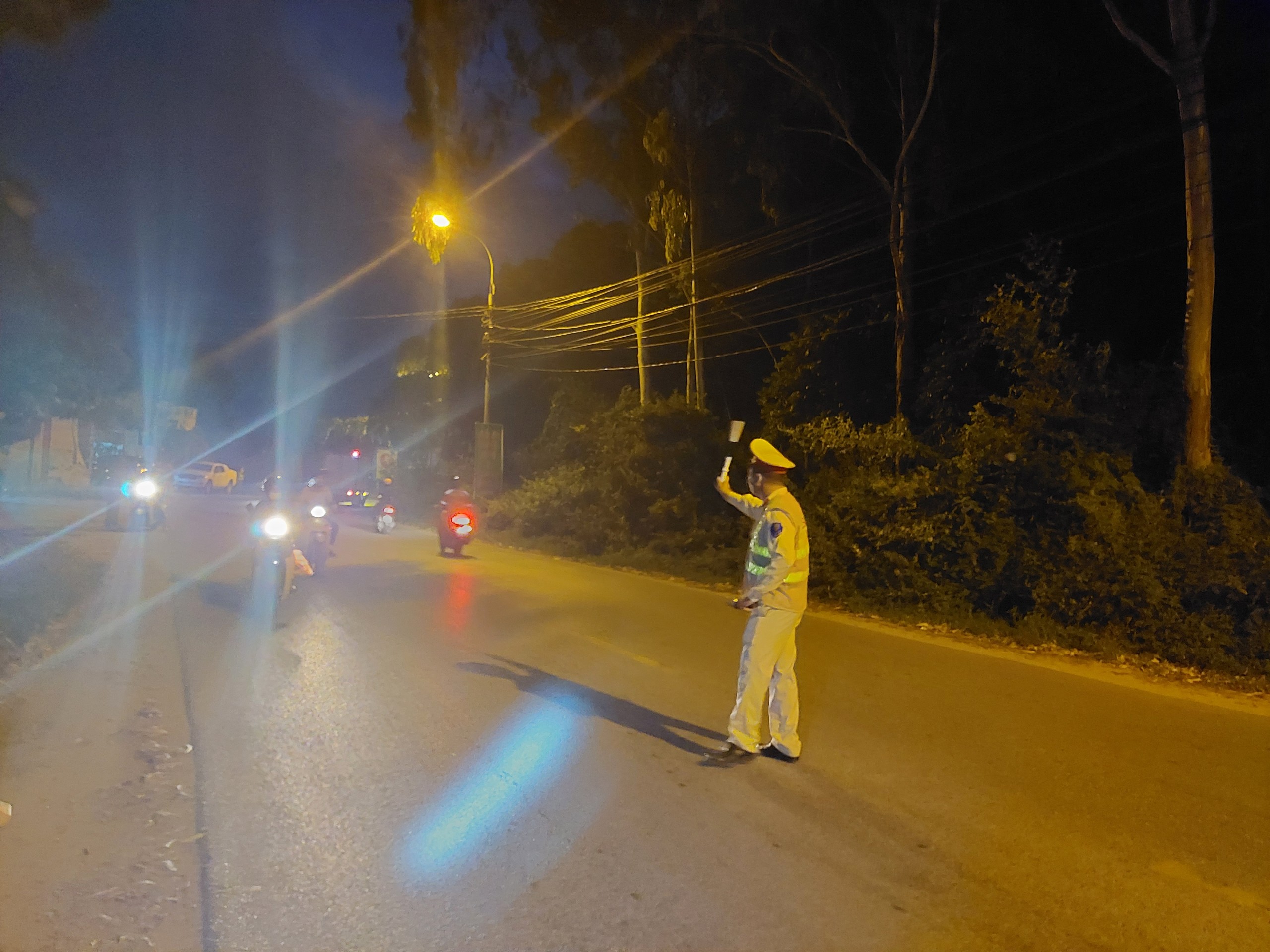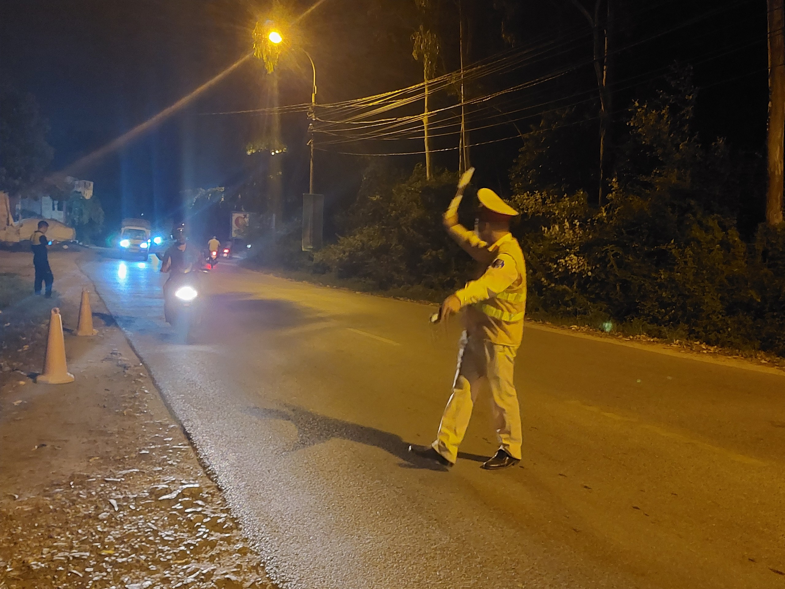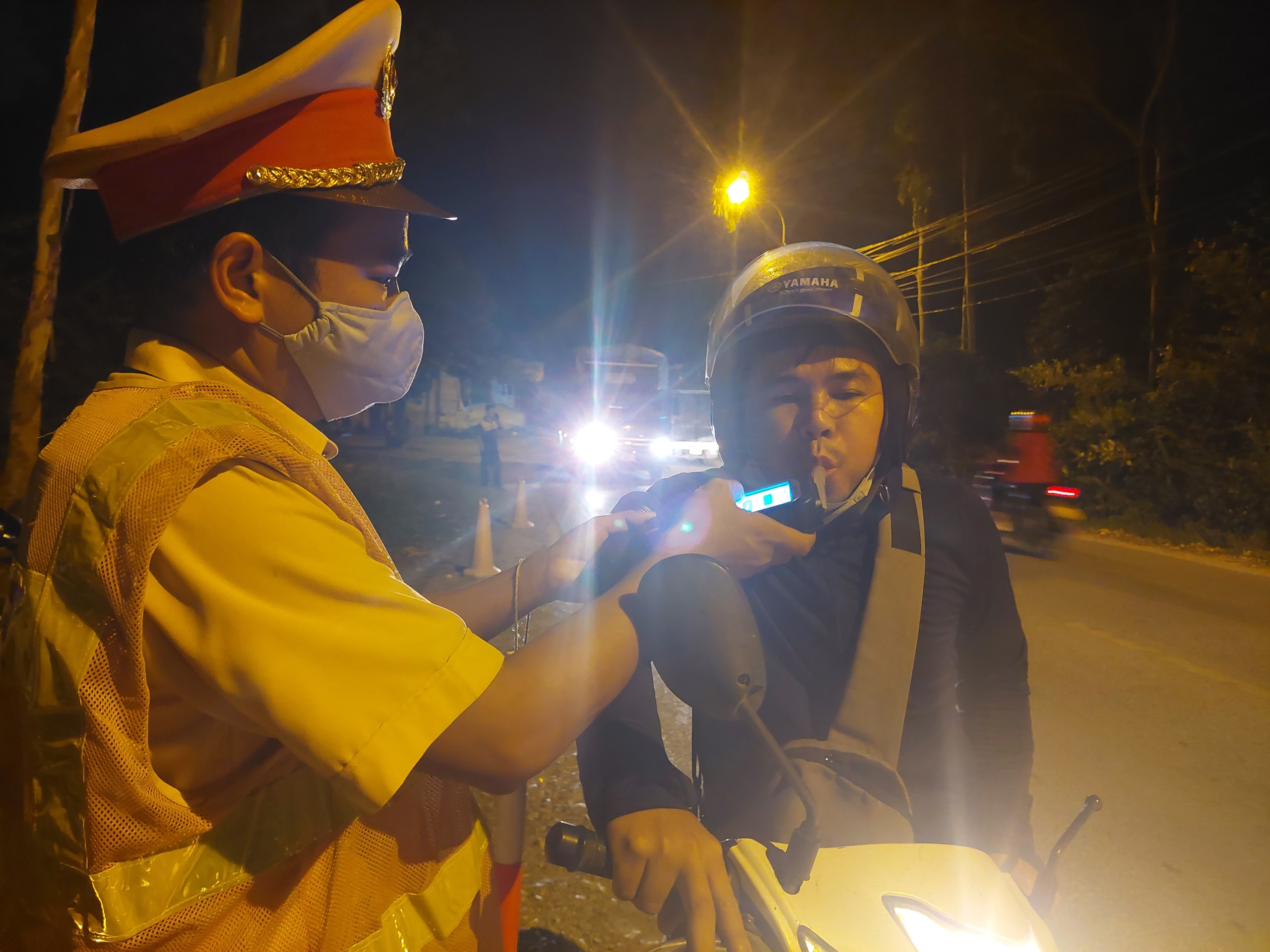 Cán bộ Đội CSGT - TT Công an huyện Sóc Sơn (Hà Nội) kiểm tra đo nồng độ cồn tài xế xe máy, ôtô tại đường tỉnh 131 (thuộc thị trấn Sóc Sơn, huyện Sóc Sơn).