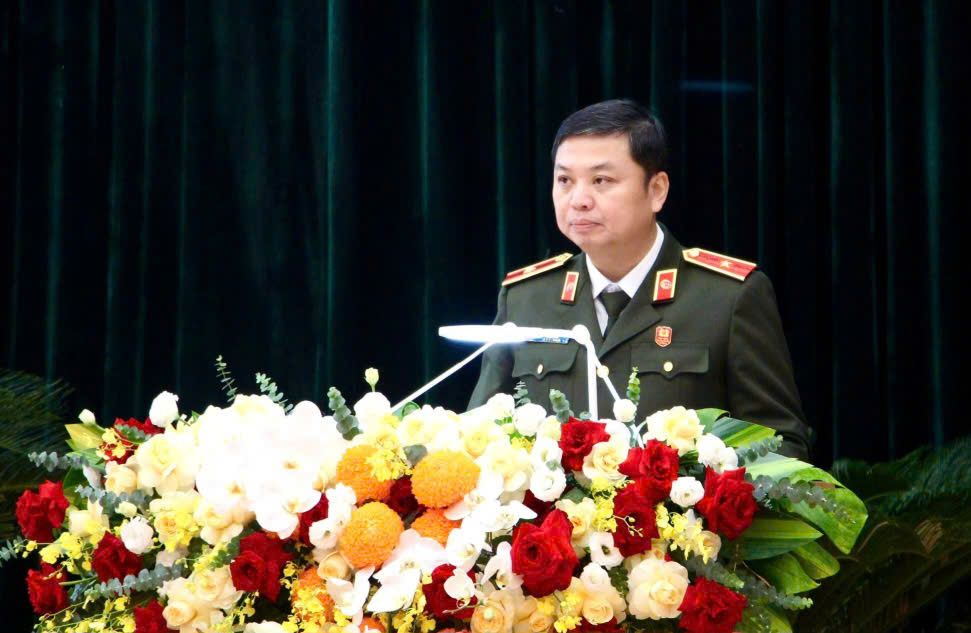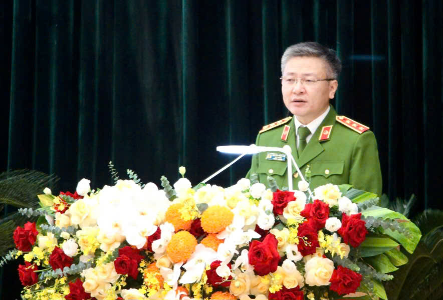 Thiếu tướng Nguyễn Tiến Trung, Giám đốc Công an tỉnh, phát biểu tại hội nghị