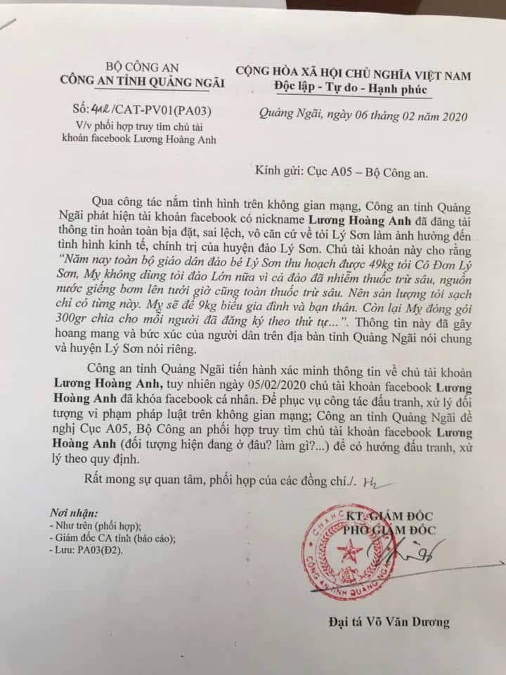 Ngày 6/2, Đại tá Võ Văn Dương - Phó Giám đốc Công an tỉnh Quảng Ngãi cho biết, sau khi vào cuộc xác minh, Công an tỉnh Quảng Ngãi xác định tài khoản facebook Lương Hoàng Anh ở TP Hồ Chí Minh. Do đó, Công an tỉnh Quảng Ngãi có văn bản gửi Cục An ninh mạng và Phòng, chống tội phạm sử dụng công nghệ cao (Bộ Công an) hỗ trợ xác minh, làm rõ danh tính và sau đó đưa ra hướng xử lý đối với chủ tài khoản facebook này.