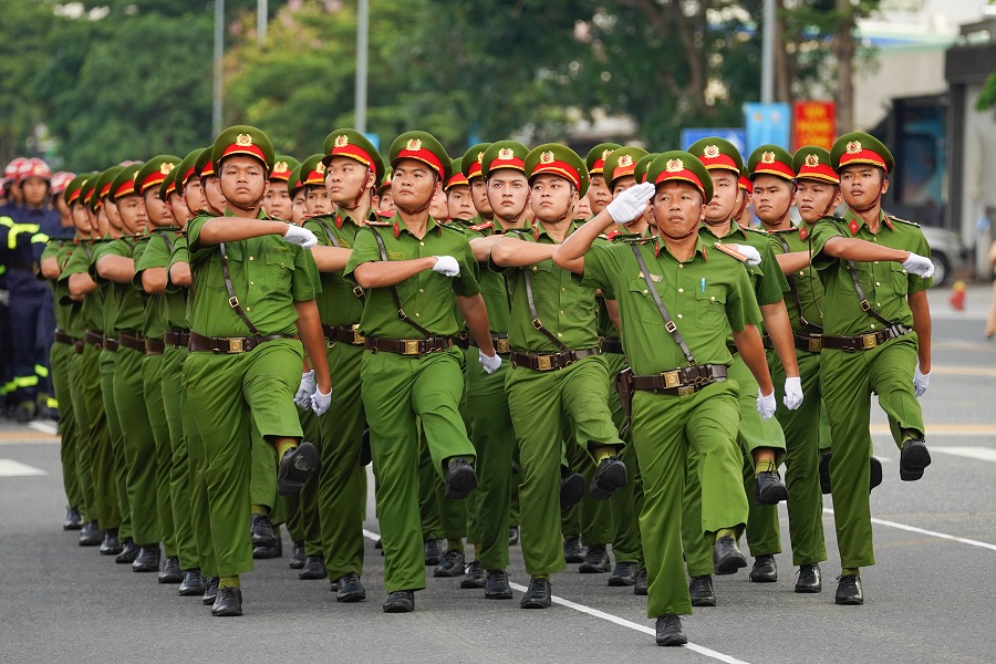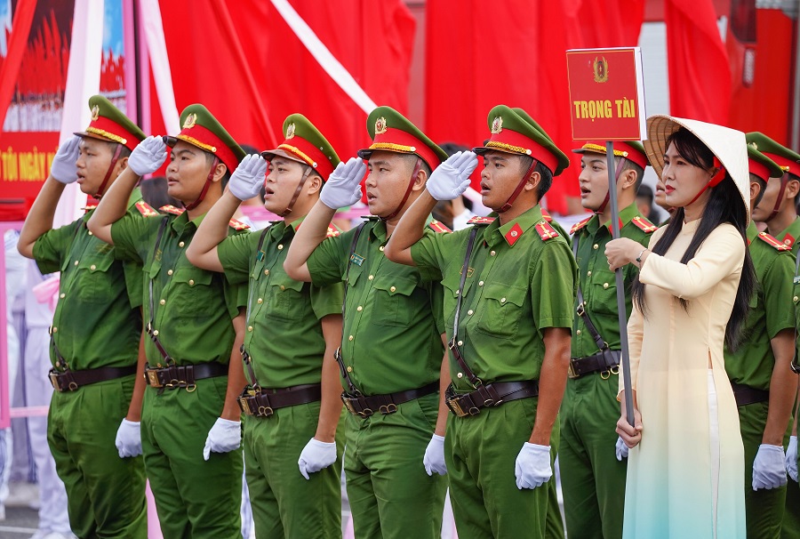Hình ảnh lực lượng Công an TP Hồ Chí Minh, vận động viên các đội tuyển, phương tiện diễu hành chào mừng chung kết hội thi.