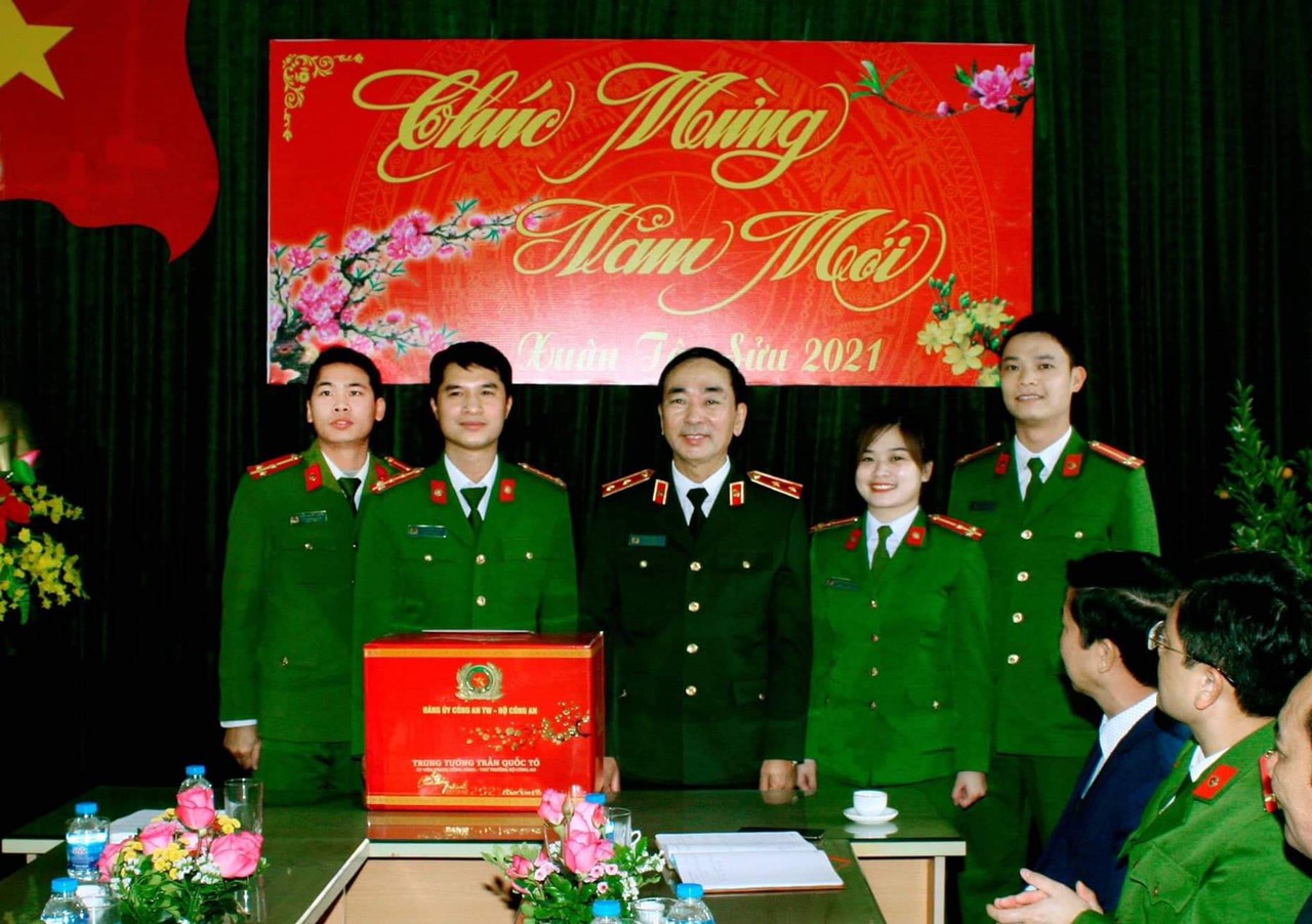Trung tướng Trần Quốc Tỏ, Ủy viên Trung ương Đảng, Thứ trưởng Bộ Công an chúc tết, tặng quà cán bộ, chiến sĩ Công an xã Nghĩa Sơn (Nghĩa Hưng, Nam Định) ngày 5/2/2021. Ảnh do cơ sở cung cấp.