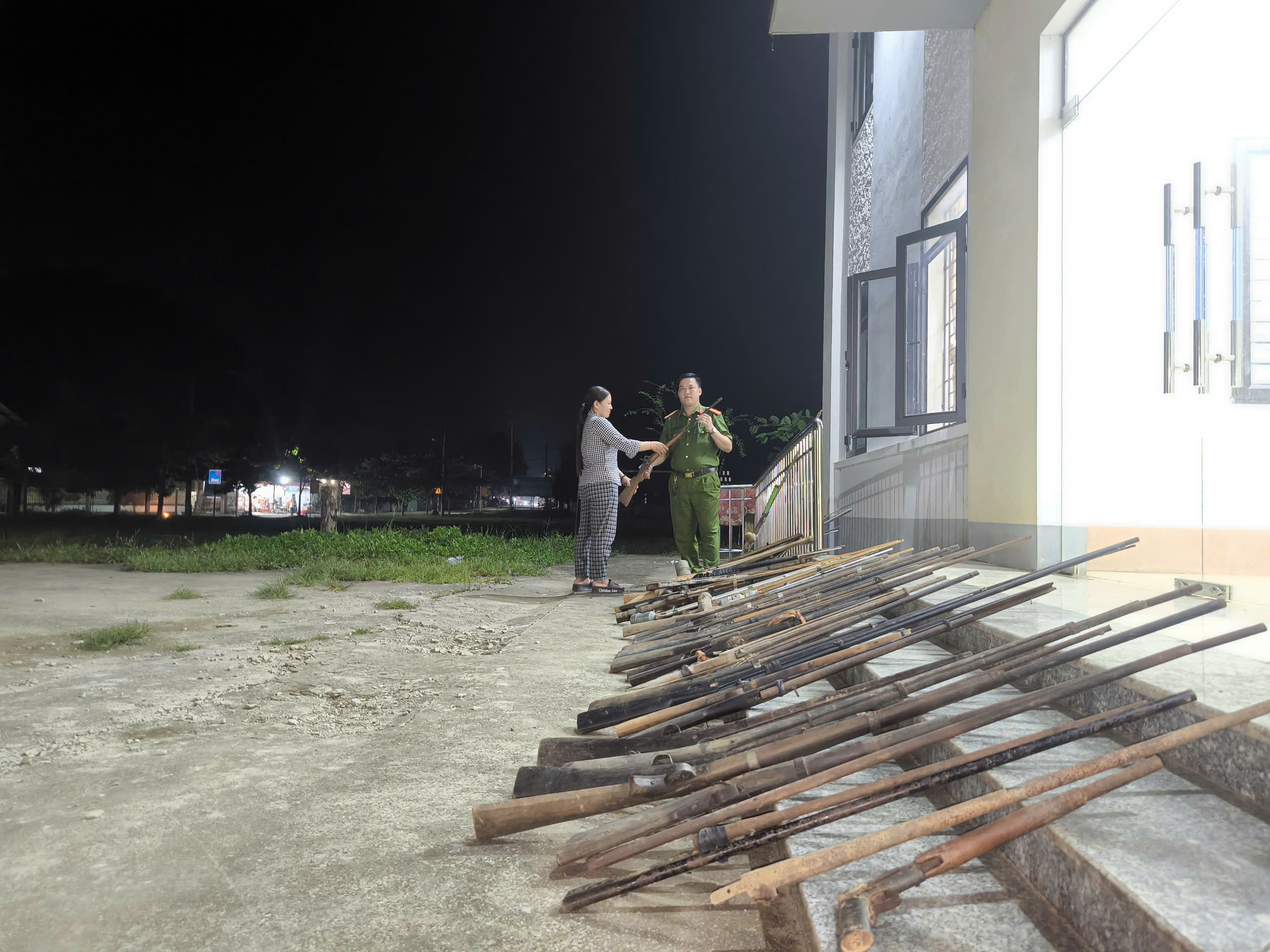 Dù đã tối muộn nhưng ở khu vực sân trụ sở Công an xã, Thiếu tá Hoàng Văn Chuyển (Phó Trưởng Công an xã Phú Linh) vẫn đang miệt mài cùng với cán bộ chiến sĩ của đơn vị làm các thủ tục thu hồi vũ khí, vật liệu nổ, công cụ hỗ trợ mà người dân tự nguyện đến giao nộp cho cơ quan Công an.