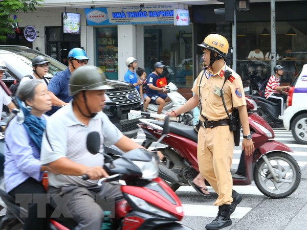 | Cảnh sát giao thông làm nhiệm vụ tại phố Hàng Bài-Tràng Tiền. (Ảnh: Doãn Tấn/TTXVN) |