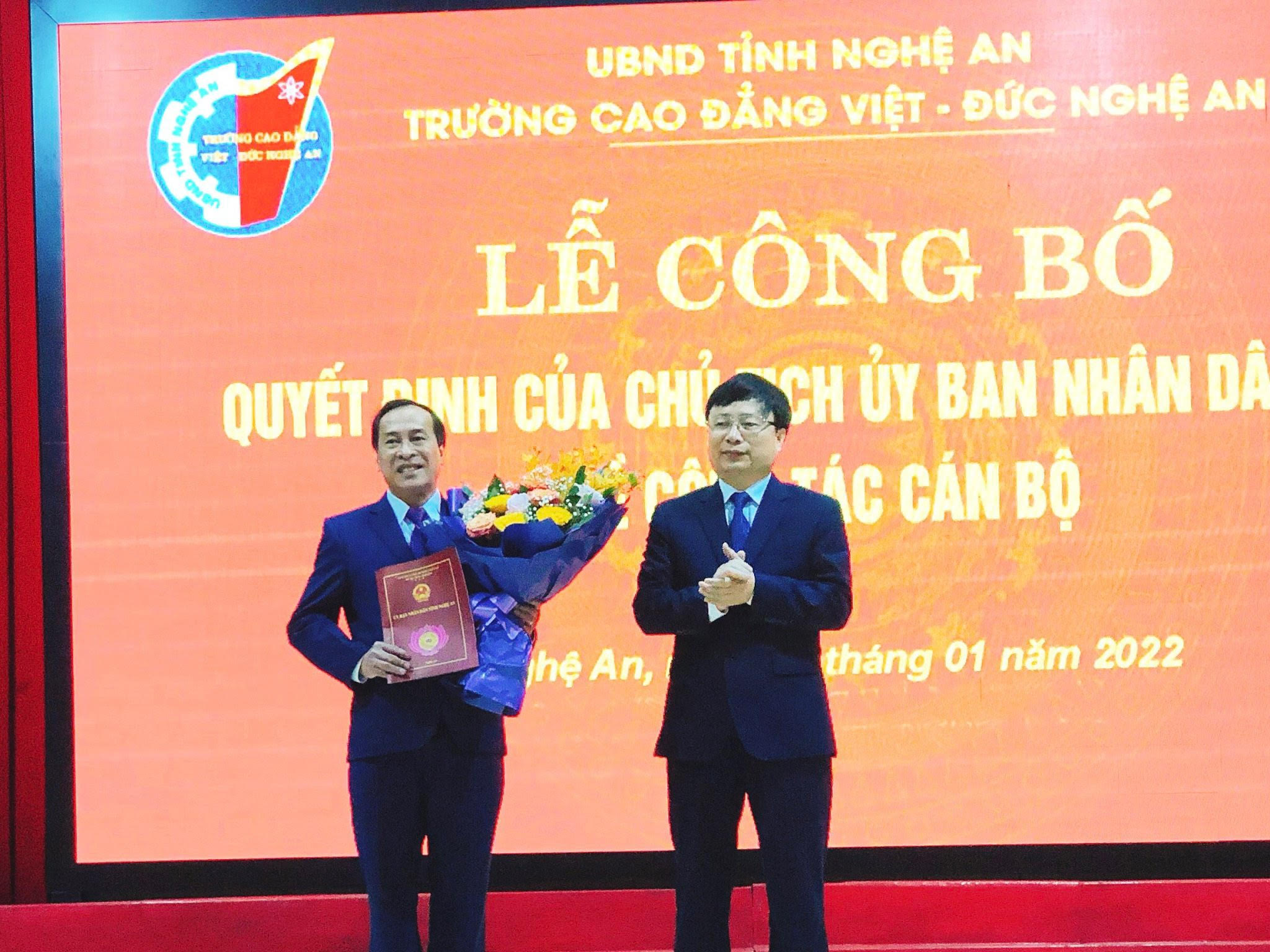 Tại buổi lễ đã công bố quyết định số 99-QĐ/UBND ngày 12/1/2021 của Chủ tịch UBND tỉnh Nghệ An về bổ nhiệm ThS. Nguyễn Hữu Hằng-Phó hiệu trưởng trường Cao đẳng Việt-Đức nhiệm kì 2019-2024 giữ chức Hiệu trưởng trường Cao đẳng Việt-Đức, nhiệm kỳ 5 năm.