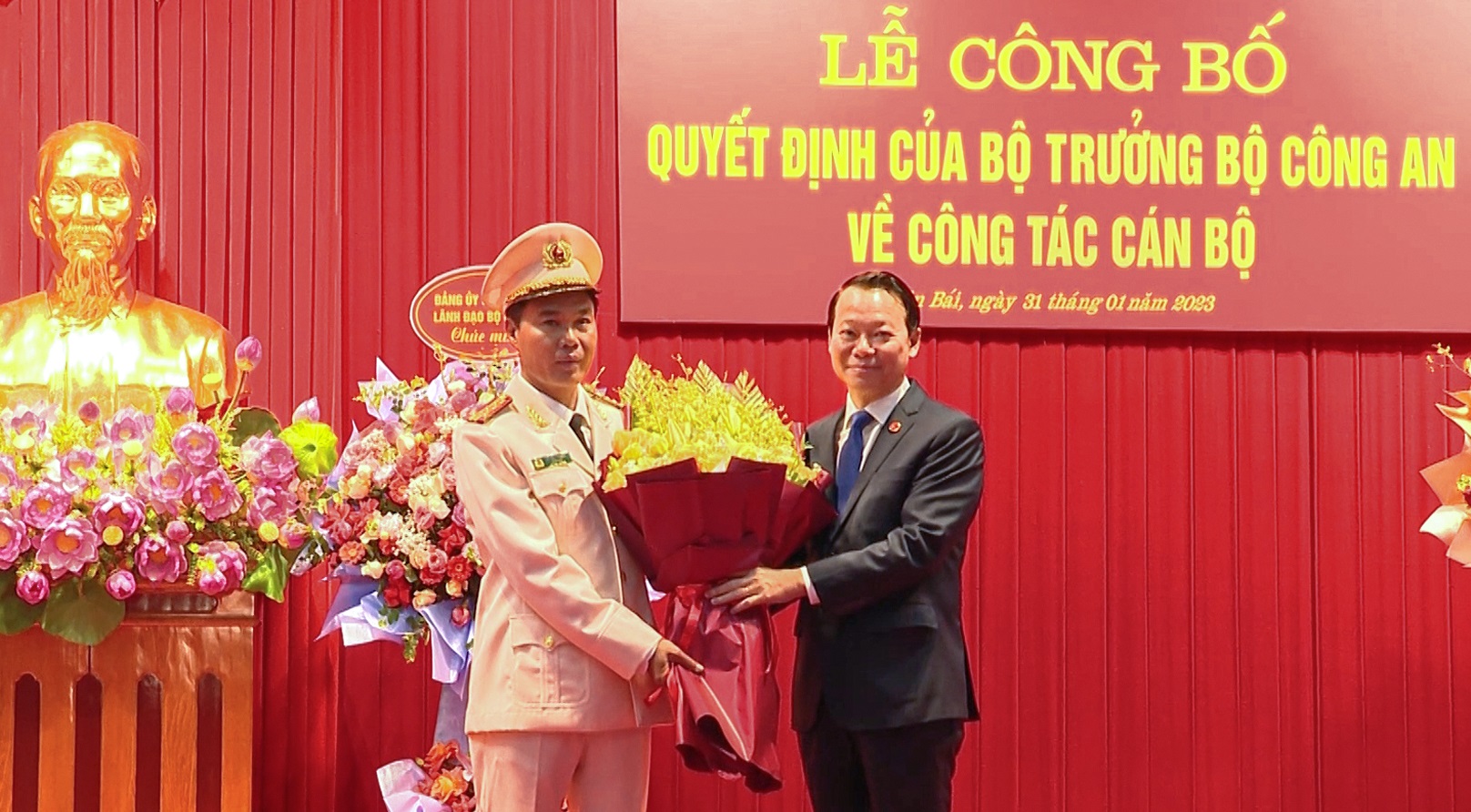 Tại buổi Lễ, được sự ủy quyền của Bộ trưởng Bộ Công an, Thượng tướng Trần Quốc Tỏ - Thứ trưởng Bộ Công an đã công bố Quyết định của Bộ trưởng Bộ Công an về việc điều động Đại tá Lê Việt Thắng, Giám đốc Công an tỉnh Bạc Liêu, đến nhận công tác và giữ chức vụ Giám đốc Công an tỉnh Yên Bái. Đồng thời thông báo Quyết định của Bộ trưởng Bộ Công an về việc điều động, bổ nhiệm Đại tá Đặng Hồng Đức, Giám đốc Công an tỉnh Yên Bái, đến nhận công tác và giữ chức vụ Chánh văn phòng Bộ Công an kể từ ngày 1/2/2023.