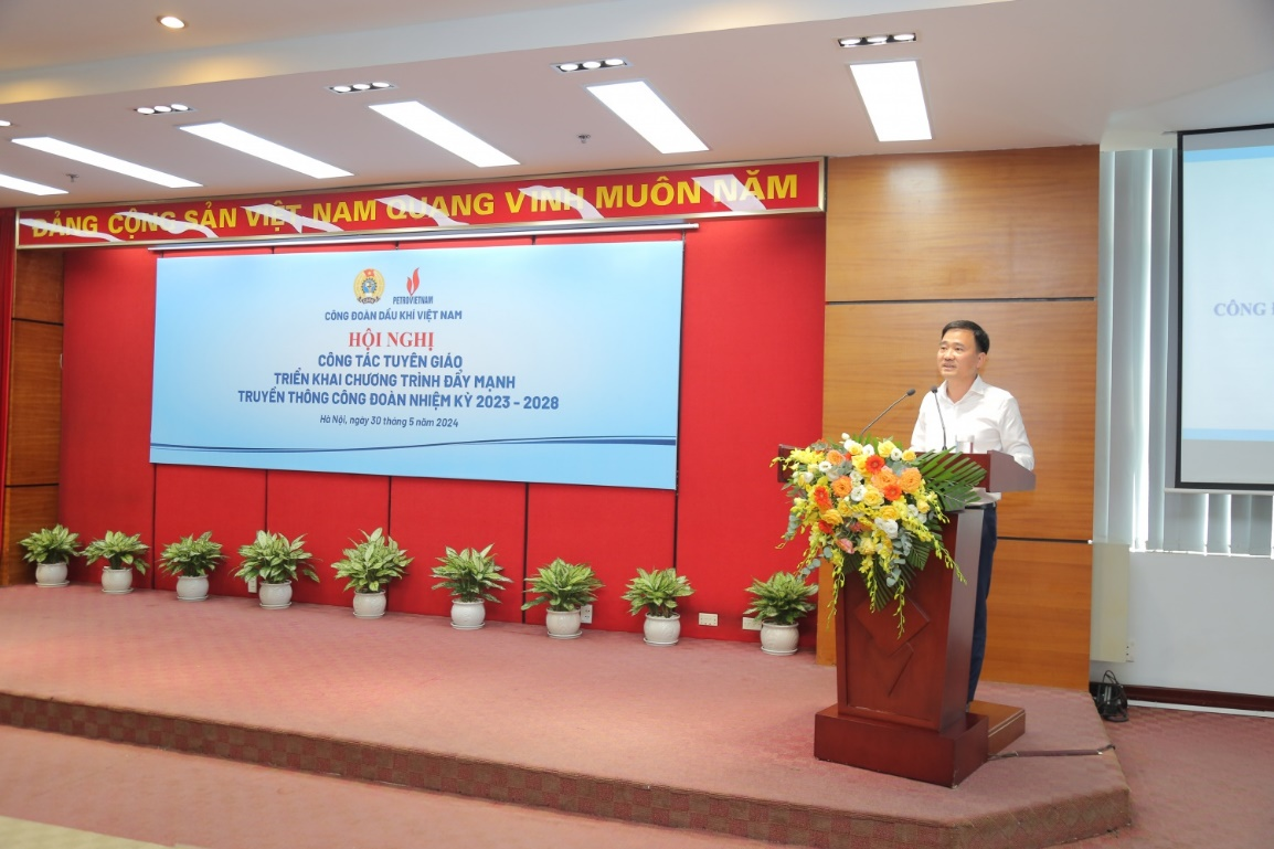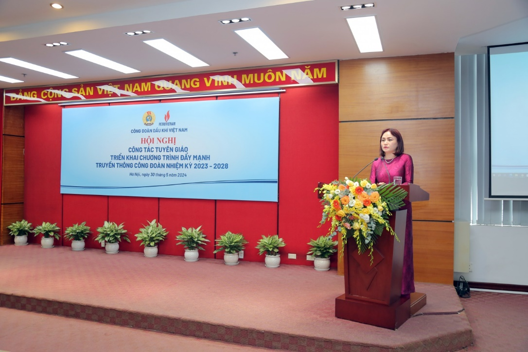 Hội nghị đã nghe đồng chí Lương Thị Hồng Nhung, Ủy viên Ban Thường vụ, Trưởng Ban Tuyên giáo - Nữ công CĐ DKVN trình bày báo cáo công tác tuyên giáo công đoàn và triển khai một số nhiệm vụ trọng tâm trong thời gian tới. Trong thời gian qua, công tác tuyên giáo, truyền thông công đoàn luôn được các cấp lãnh đạo Tổng Liên đoàn, Đảng ủy Tập đoàn, CĐ DKVN quan tâm, chỉ đạo. Đây cũng được xác định là một trong những nhiệm vụ trọng tâm của các cấp công đoàn trong toàn ngành Dầu khí, được triển khai nghiêm túc, với nhiều hình thức, phương pháp đổi mới, phù hợp với từng loại hình công đoàn cơ sở, đơn vị. Nội dung tuyên truyền phong phú, đa dạng, thiết thực, phù hợp với đoàn viên, người lao động.