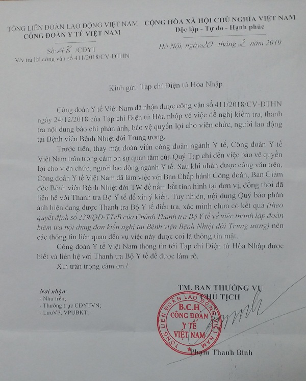Nội dung công văn nêu: “Trước tiên, thay mặt đoàn viên công đoàn ngành Y tế, Công đoàn Y tế Việt Nam trân trọng cảm ơn sự quan tâm của Quý Tạp chí đến việc bảo vệ quyền lợi cho viên chức, người lao động ngành Y tế. Sau khi nhận được công văn trên, Công đoàn Y tế Việt Nam đã làm việc với Ban Chấp hành Công đoàn, Ban Giám đốc Bệnh viện Nhiệt đới Trung ương để nắm bắt tình hình tại đơn vị, đồng thời đã liên hệ với Thanh tra Bộ Y tế để xin ý kiến. Tuy nhiên, nội dung Quý Tạp chí phản ánh hiện đang được Thanh tra Bộ Y tế điều tra, xác minh chưa có kết quả (theo quyết định số 239/QĐ-TTrB của Chánh Thanh tra Bộ Y tế về việc thành lập đoàn kiểm tra nội dung đơn kiến nghị tại Bệnh viện Nhiệt đới Trung ương) nên các thông tin trên liên quan đến vụ việc này được coi là thông tin mật.