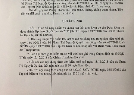 Theo thông tin mà phóng viên Hòa Nhập cập nhật được, ngày 23/01/2019, ông Nguyễn Văn Nhiên - Phó Chánh Thanh tra Bộ Y tế đã ký văn bản số 60/TTrB-P4 gửi Giám đốc Bệnh viện Nhiệt đới Trung ương với nội dung: “Công bố quyết định giao bổ sung nhiệm vụ và gia hạn thời gian kiểm tra”. Đây là công văn thứ 2 của Thanh tra Bộ Y tế liên quan đến việc phản ánh của bạn đọc đã được Hòa Nhập phản ánh và nhận được ý kiến chỉ đạo kịp thời của Bộ trưởng Bộ Y tế. Thời gian gia hạn của Đoàn kiểm tra được nêu trong quyết định số 06/QĐ-TTrB ngày 18/01/2019 (kèm theo công văn trên) là 30 ngày làm việc. Theo đó, cuối tháng 2/2019, Thanh tra Bộ Y tế phải hoàn thành nhiệm vụ và công bố kết quả kiểm tra. Tuy nhiên, cho đến nay, kết quả kiểm tra của Đoàn vẫn đang trong phạm vi “thông tin mật”.