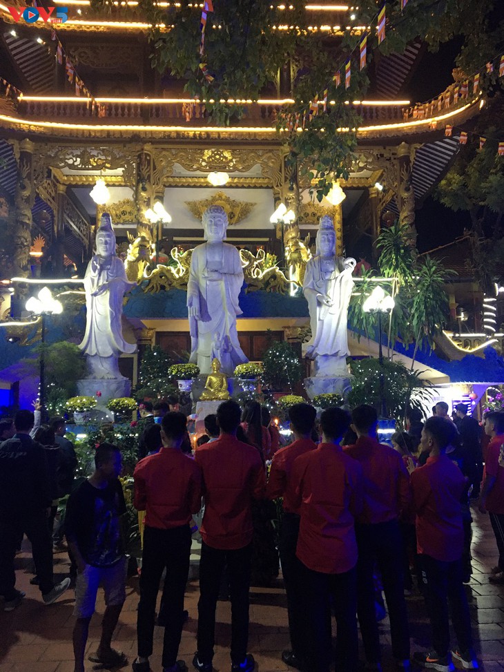Bà con Việt kiều đi lễ chùa trong đêm giao thừa. Ảnh: VOV