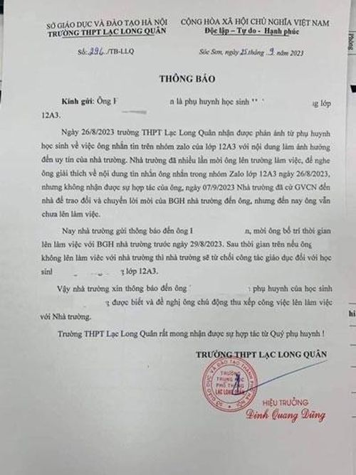 Trong ngày 5-10, mạng xã hội dậy sóng vì thông tin một học sinh bị Trường THPT Lạc Long Quân (TP Hà Nội) "từ chối giáo dục" do phụ huynh có những bình luận về việc thu chi trong hoạt động của lớp trên nhóm Zalo nhưng lại không hợp tác khi được trường mời đến làm việc.