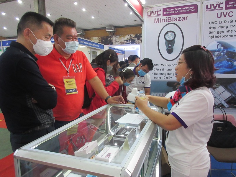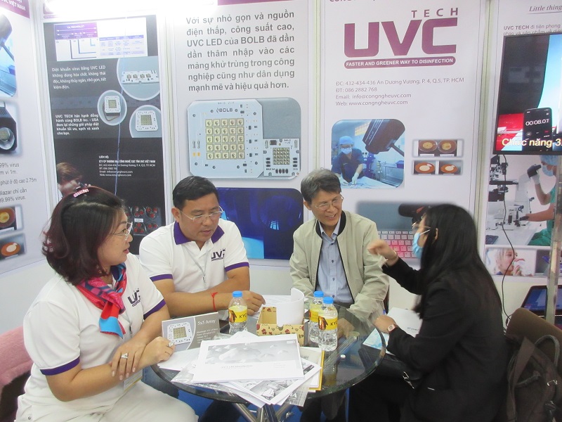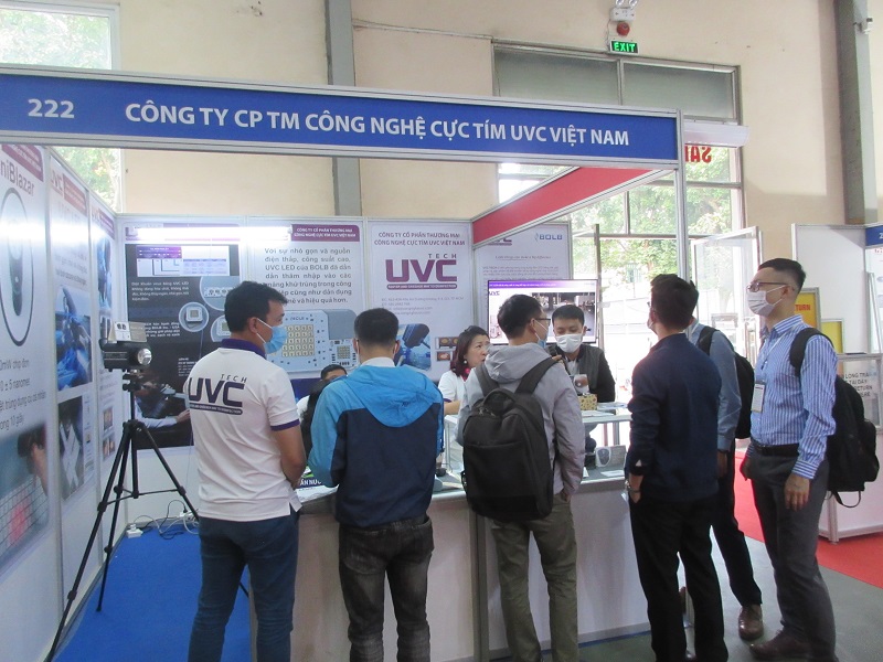 Giám đốc UVC TECH giới thiệu tính năng của sản phẩm sử dụng CHIP LED UVC với khách tham quan triển lãm