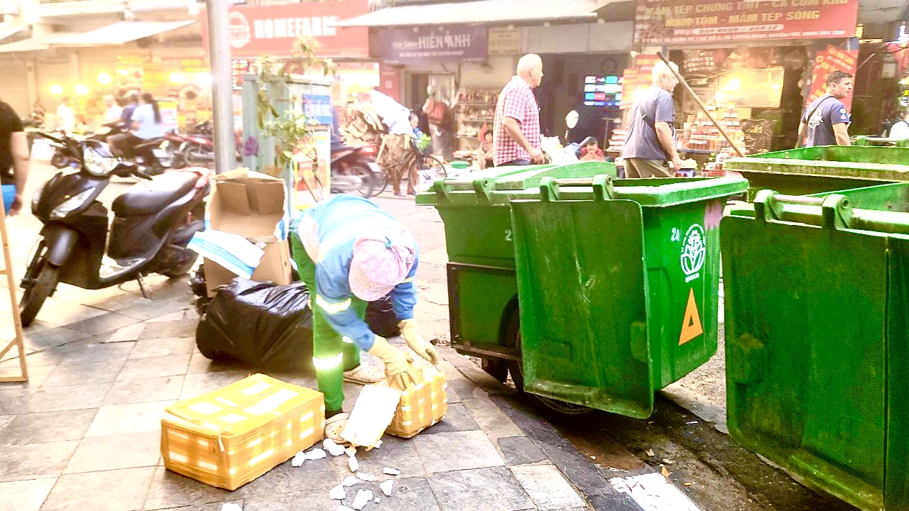 Cũng do khối lượng rác thải phát sinh trong những ngày nghỉ lễ tăng nên công nhân bắt đầu công việc sớm hơn và kết thúc muộn hơn. Từ sáng sớm, Chi nhánh Hoàn Kiếm, Công ty TNHH MTV môi trường đô thị Hà Nội đã bố trí phương tiện, dụng cụ đi quét dọn, thu gom rác thải của các hộ dân, các tiểu thương dọc các tuyến đường trên địa bàn quận Hoàn Kiếm.