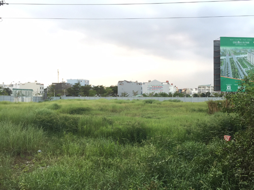Thế nhưng theo quan sát, hiện nay toàn bộ khu đất triển khai vẫn đang là bãi đất trống cỏ mọc. Dọc các tuyến đường có treo các tấm pano quảng cáo về dự án. Bên ngoài chẳng có rào chắn, bên trong chỉ có hai xe cần cẩu, một số ống cọc và vài khối đá bê tông nhưng không thấy bóng dáng công nhân thi công.