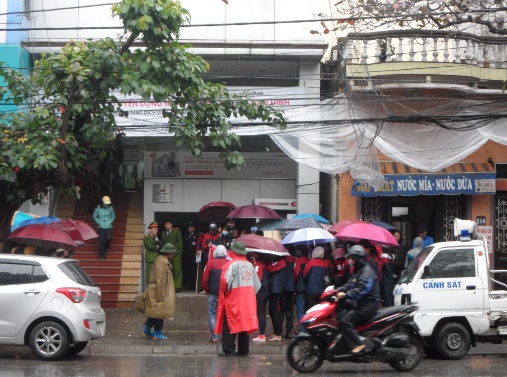 Gần 50 nhân viên CTCP Thúy Đạt căng biểu ngữ, hô khẩu hiệu trước trụ sở Ngân hàng Techcombank - Chi nhánh Nam Định - Ảnh Hồ Thanh