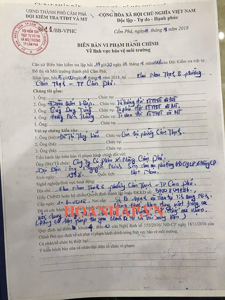 | Biên bản vi phạm hành chính của Công ty CP Xi măng Cẩm Phả |