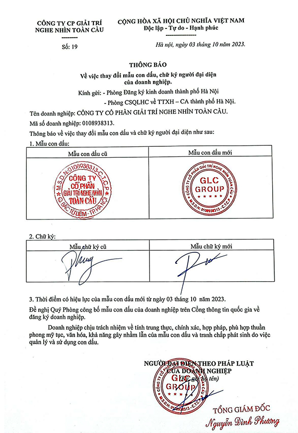 Thông báo về việc thay đổi mẫu con dấu, chữ ký người đại diện của Công Ty Cổ phần Giải trí Nghe nhìn Toàn Cầu