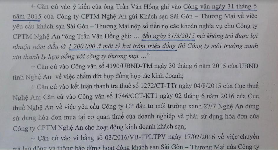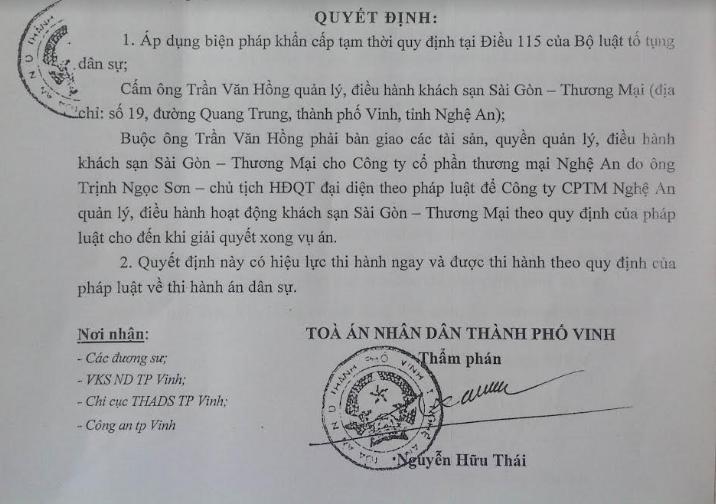 Sau gần 1 năm toan tính kỹ lưỡng, ngày 09/5/2016, Công ty CP Thương mại Nghệ An đã gửi đơn khởi kiện tới Tòa án nhân dân TP Vinh. Và, ngày 16/6/2016, Công ty CP Thương mại Nghệ An làm đơn bổ sung, yêu cầu TAND TP Vinh “áp dụng biện pháp khẩn cấp tạm thời” với mục đích “đuổi bằng được đối tác ra khỏi khách sạn”. Sáng kiến của ông Sơn được TAND TP Vinh thực thi bằng 2 lần ra quyết định “áp dụng biện pháp khẩn cấp tạm thời” (ngày 20 và 27/6/2016) có nội dung hệt nhau nhưng nhiều đoạn sai về số liệu, sai tên pháp nhân…