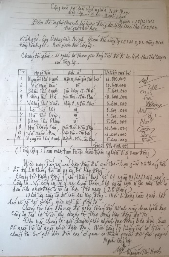 Ngày 22/11/2016, (Tức là đã hết 18 tháng kể từ ngày ký hợp đồng) những người có tên trong đơn chưa sử dụng thẻ Coupon có nguyện vọng thanh lý hợp đồng nên cô Hà Thị Diệp (người đứng tên trong đơn) ở khu phố 3, thị trấn Mậu A đã gửi toàn bộ danh sách, hợp đồng, phiếu thu tiền và đơn đề nghị đến Cty Hoàng Ninh để thanh lý hợp đồng, nhưng đến nay vẫn chưa được giải quyết.