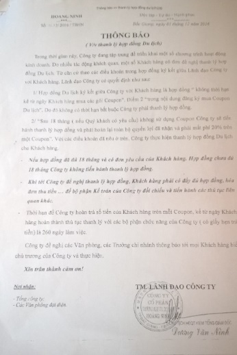 Qua tìm hiểu chúng tôi được biết ngày 01/12/2016, Cty Hoàng Ninh có ra Thông báo số 01.12.2016/TBNH về việc thanh lý hợp đồng du lịch do Chủ tịch HĐQT kiêm Tổng giám đốc Dương Văn Ninh ký và đóng dấu. Trong thông báo này ghi rõ: Thời hạn để Công ty hoàn trả số tiền của khách hàng trên mỗi Coupon, kể từ ngày khách hàng hoàn thành thủ tục thanh lý với các bộ phận chức năng của Công ty (có giấy hẹn trả tiền) là 260 ngày làm việc. Điều kiện này không có trong hợp đồng mà những người đứng đơn đã ký kết với Cty Hoàng Ninh.