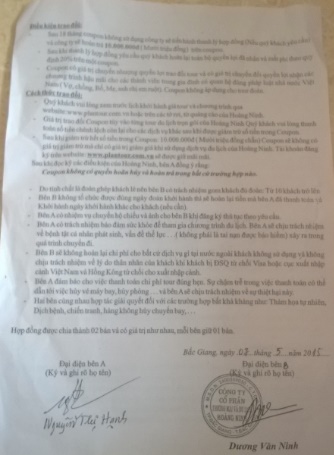 Cụ thể: ngày 7/5/2015, bà Nguyễn Thị Hạnh và 10 người khác đều ở tỉnh Yên Bái (có tên trong đơn) đã tham gia hợp đồng du lịch theo thẻ Coupon của Cty Hoàng Ninh, với tổng trị giá 88.400.000 đồng, bao gồm cả phí sinh hoạt câu lạc bộ.