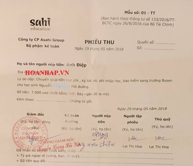 | Phiếu thu tiền Du học Hàn Quốc cho học viên của công ty Asahi Group |