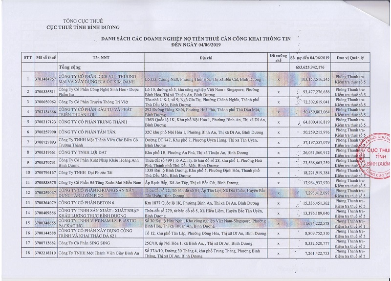 Công ty Kim Oanh là là doanh nghiệp đứng top đầu nợ thuế trên địa bàn tỉnh Bình Dương tính đến tháng 6/2019.