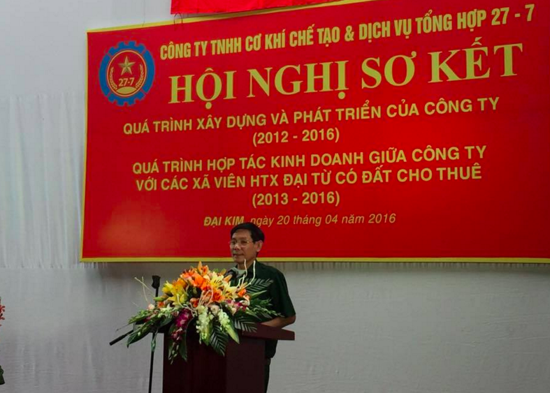 HOANHAP.VN - Sáng ngày 20/4, tại Hà Nội, Công ty TNHH cơ khí chế tạo và dịch vụ tổng hợp 27 - 7 đã tổ chức Hội nghị sơ kết quá trình xây dựng và phát triển của Công ty (2012 – 2016) và quá trình hợp tác kinh doanh giữa Công ty với các xã viên HTX Đại Từ có đất cho thuê (2013 – 2016).