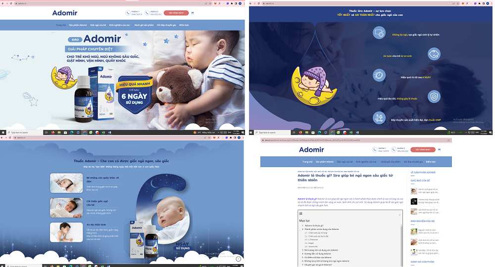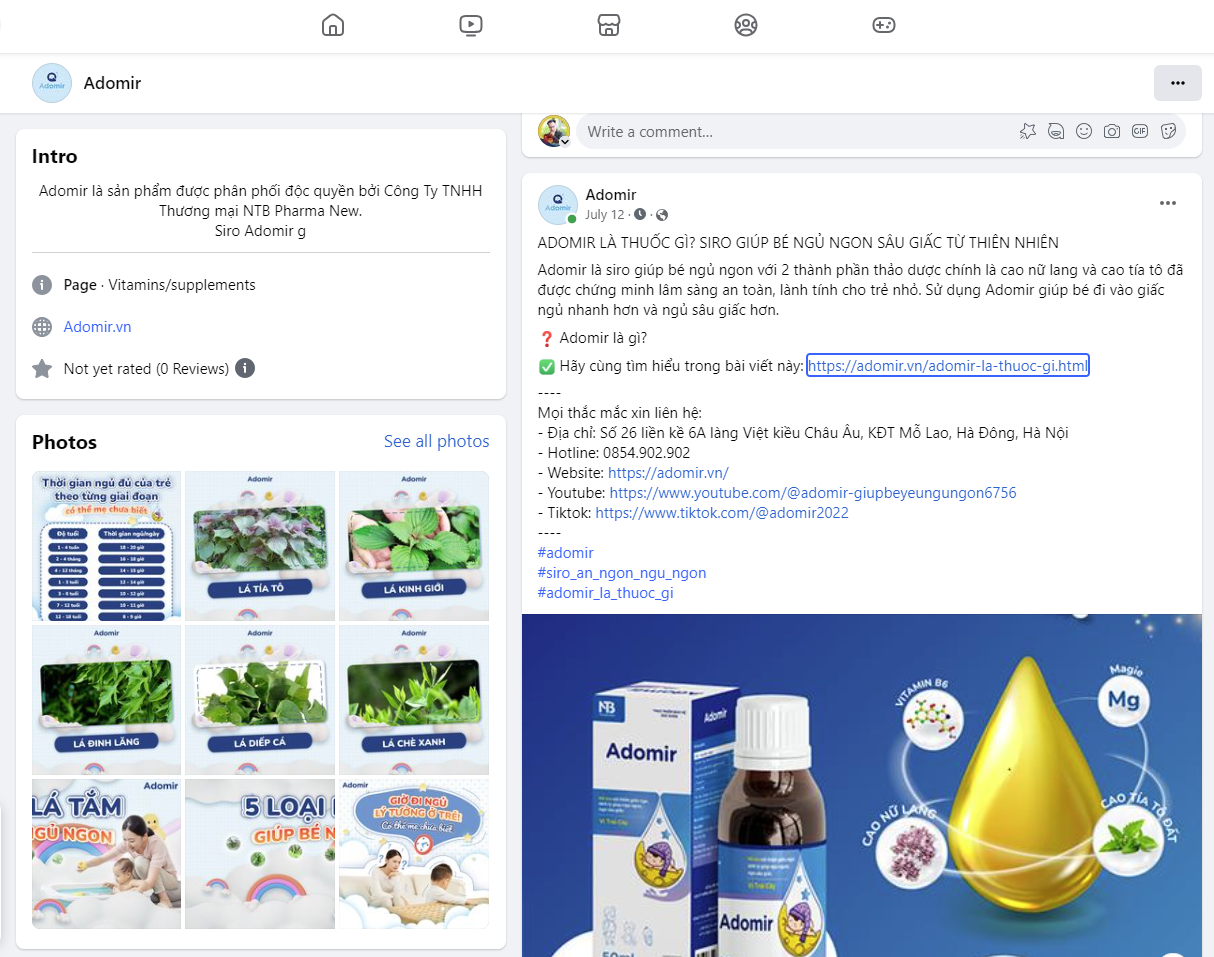 Theo giấy tiếp nhận đăng ký bản công bố sản phẩm số 4432/2021/ĐKSP, thực phẩm bảo vệ sức khỏe Adomir do công ty TNHH Thương mại NTM Pharma New đăng ký là thực phẩm chức năng. Tuy nhiên trên toàn hệ thống quảng bá sản phẩm này công ty đã quảng cáo sản phẩm là “Thuốc Adomir”. Trên trang Website chính thức của Adomir do công ty quản lý đều quảng cáo đây như là một loại thuốc giúp trẻ “ngủ ngon sâu giấc”. Trên trang website này cũng có bài viết thể hiện rằng Adomir là thuốc: https://adomir.vn/adomir-la-thuoc-gi.html. Ngoài ra, trên trang facebook của sản phẩm này cũng đều dùng từ thuốc để gọi đối với sản phẩm này.