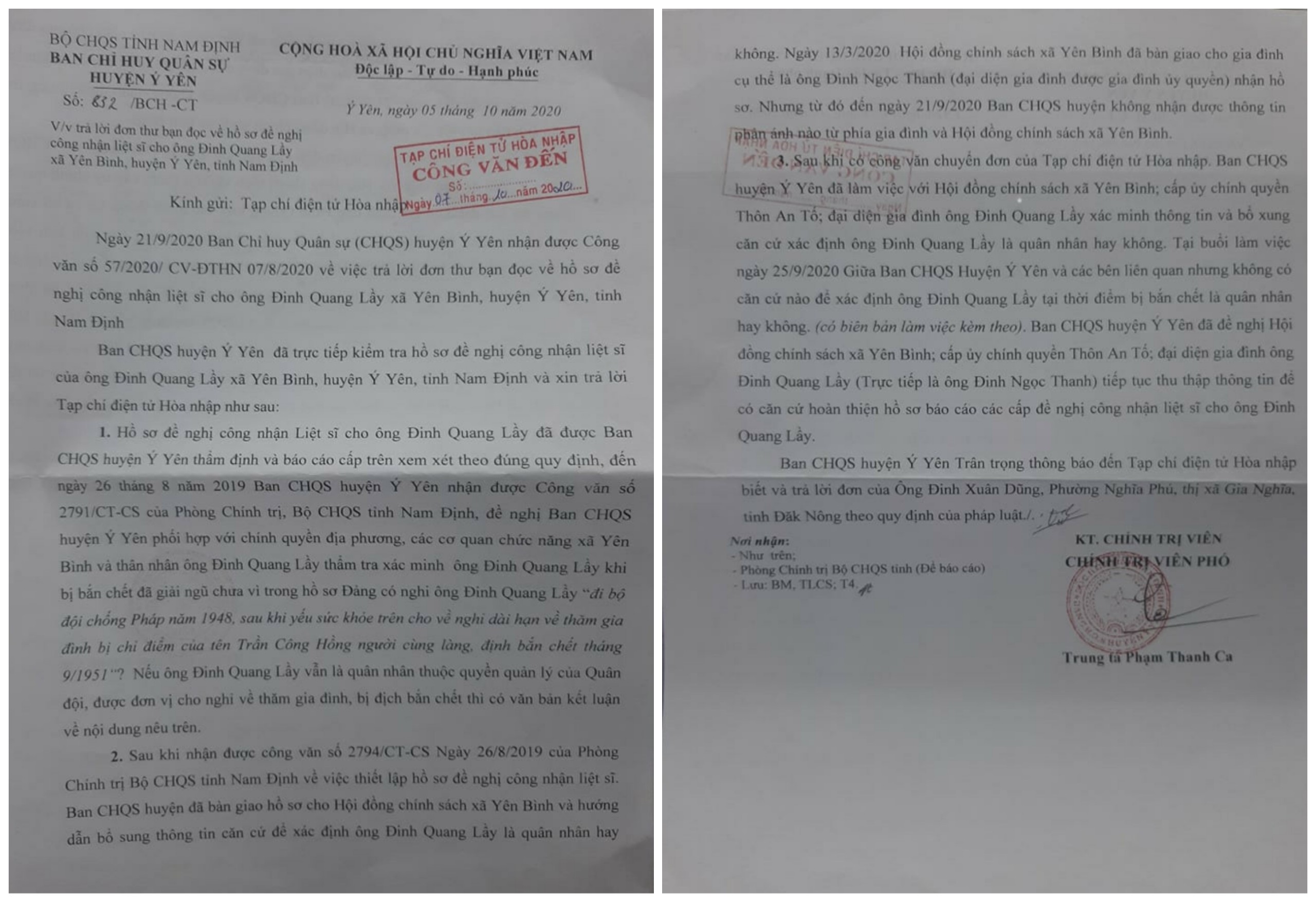 Công văn số 832/BCH-CT có nội dung như sau: “Ngày 21/9/2020, Ban Chỉ huy Quân sự (CHQS) huyện Ý Yên nhận được Công văn số 57/2020/CV-ĐTHN 07/8/2020 về việc trả lời đơn thư bạn đọc về hồ sơ đề nghị công nhận liệt sỹ cho ông Đinh Quang Lầy, xã Yên Bình, huyện Ý Yên, tỉnh Nam Định.