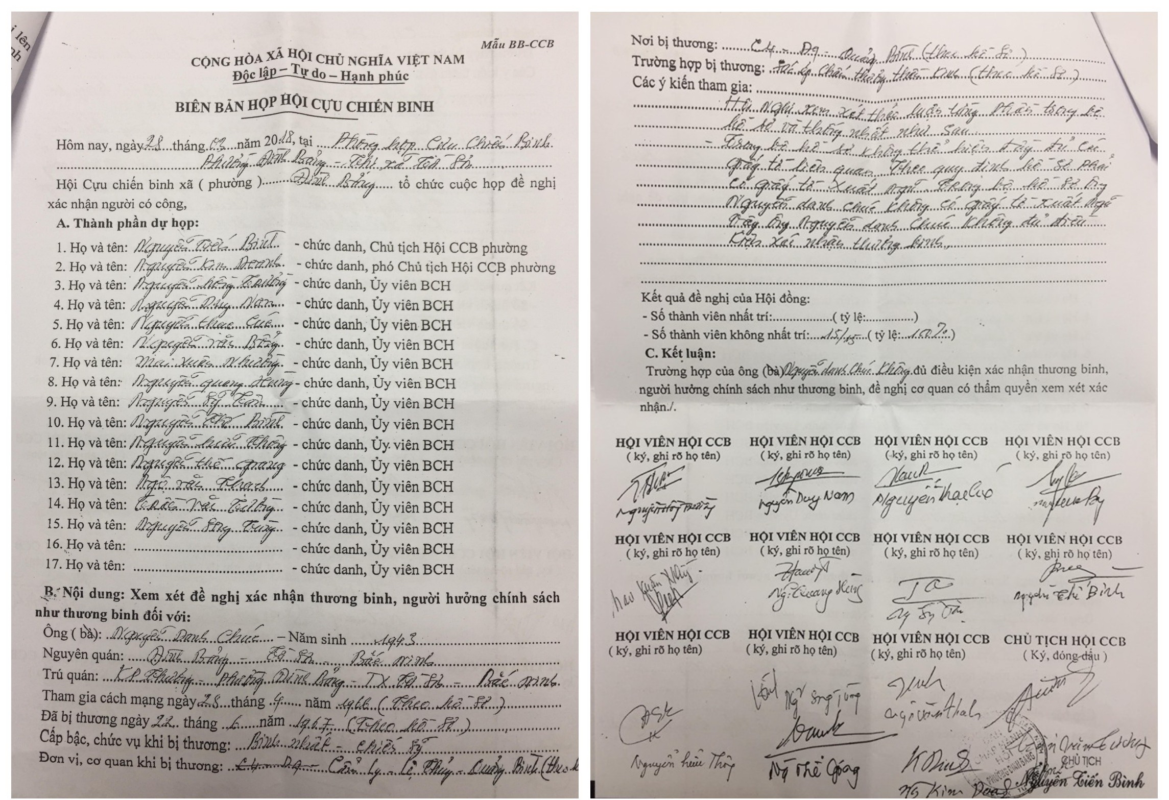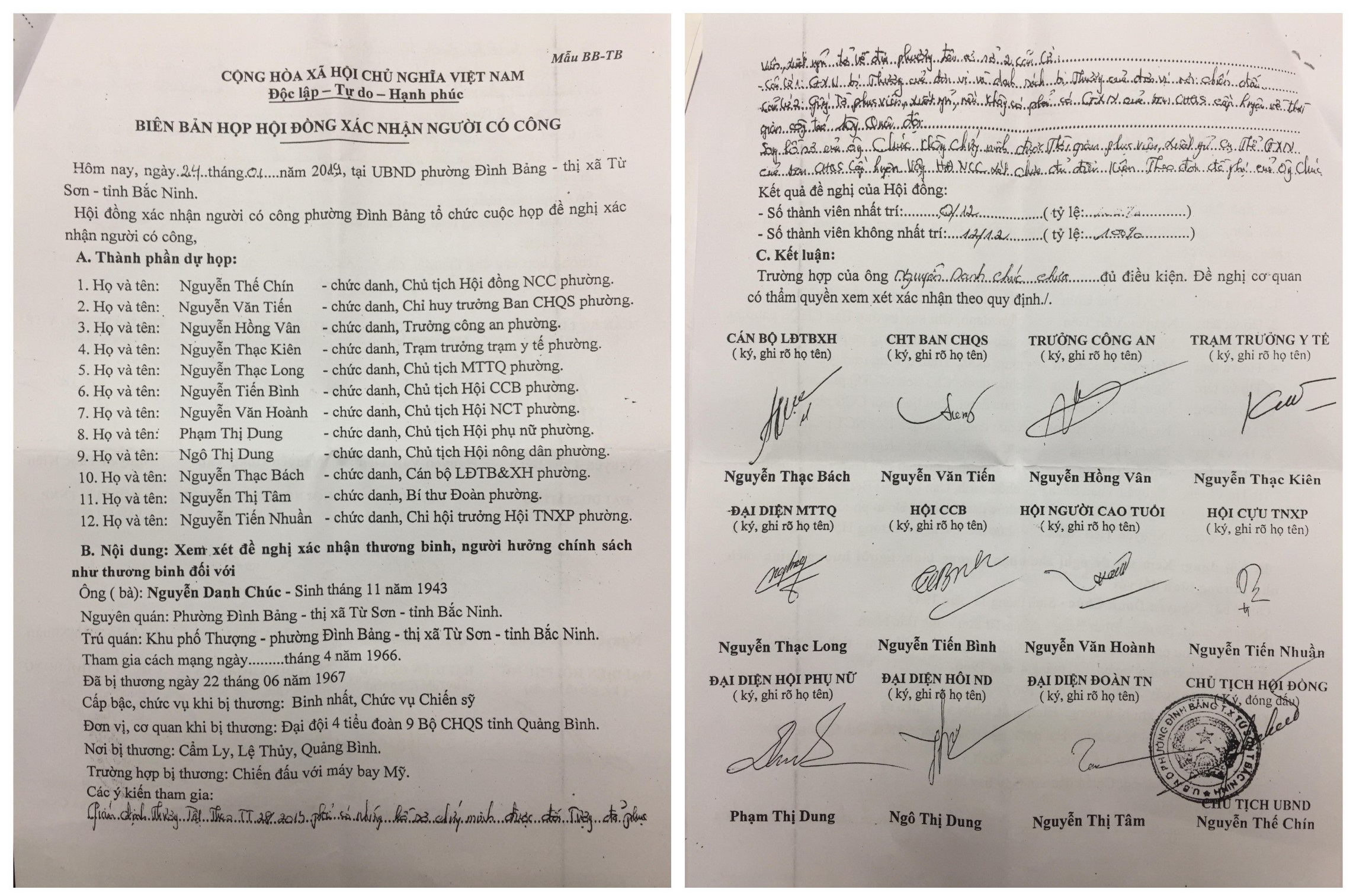- Kết quả, Hội Cựu chiến binh phường không nhất trí đề nghị xác nhận thương binh và hưởng chế độ thương binh đối với ông Nguyễn Danh Chúc. Lý do: chưa đủ giấy tờ chứng minh ông Nguyễn Danh Chúc đã hoàn thành nghĩa vụ quân sự, xuất ngũ trở về địa phương (có biên bản photo kèm theo).