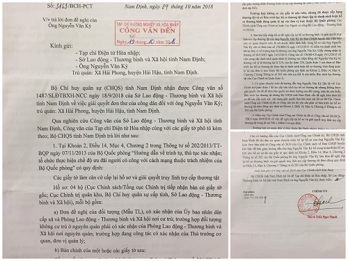 Nội dung Công văn số 3153/ BCH-PCT có đoạn ghi: “Qua nghiên cứu Công văn của Sở Lao động - Thương binh và Xã hội tỉnh Nam Định, Công văn của Tạp chí Điện tử Hòa nhập cùng các giấy tờ phô tô kèm theo; Bộ CHQS tỉnh Nam Định trả lời như sau: