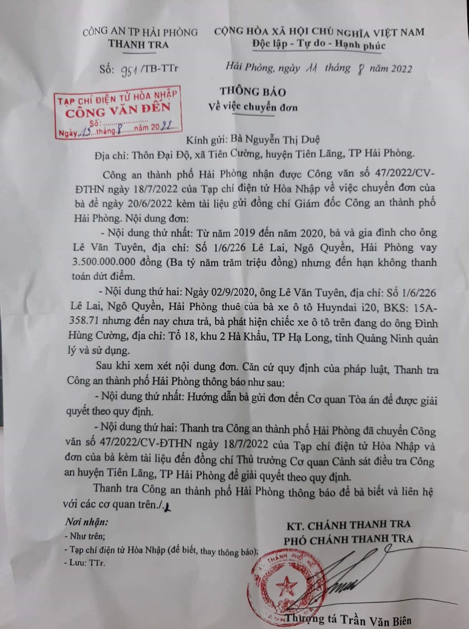 Thông báo số 951/TB-TTr có nội dung như sau: “Công an thành phố Hải Phòng nhận được Công văn số 47/2022/CV-ĐTHN ngày 18/07/2022 của Tạp chí điện tử Hòa Nhập về việc chuyển đơn của bà đề ngày 20/6/2022 kèm tài liệu gửi đồng chí Giám đốc Công an thành phố Hải Phòng. Nội dung đơn:
