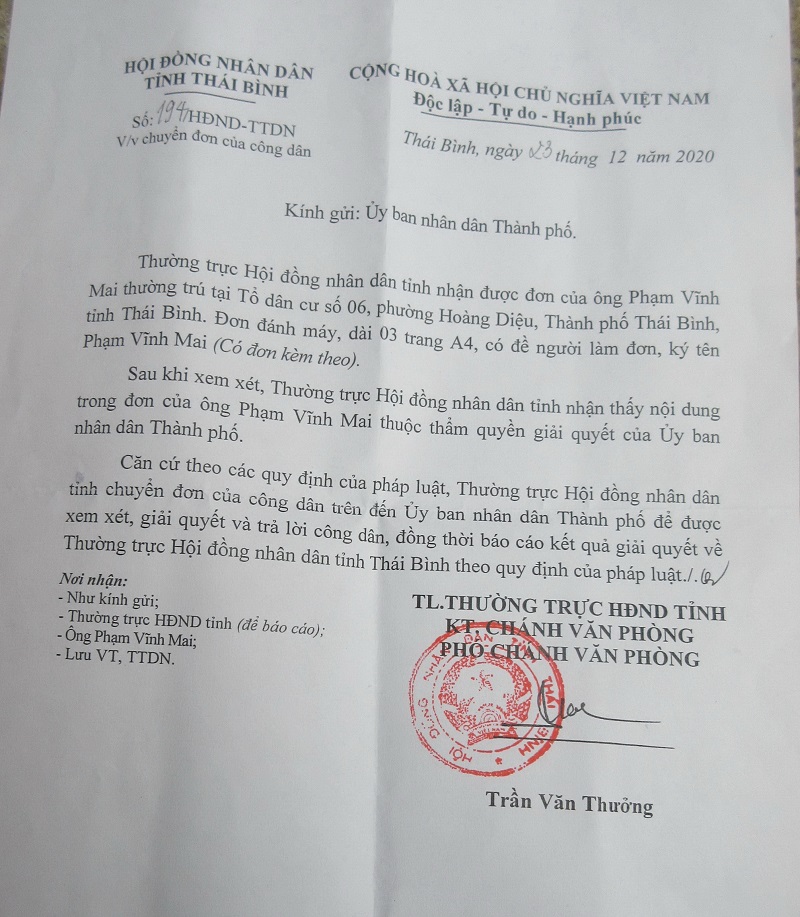 Văn bản số 194/HĐND - TTDN có nội dung như sau: “Thường trực Hội đồng nhân dân tỉnh nhận được đơn của ông Phạm Vĩnh Mai thường trú tại Tổ dân cư số 06, phường Hoàng Diệu, Thành phố Thái Bình, tỉnh Thái Bình. Đơn đánh máy, dài 03 trang A4, có đề người làm đơn, ký tên Phạm Vĩnh Mai (Có đơn kèm theo).