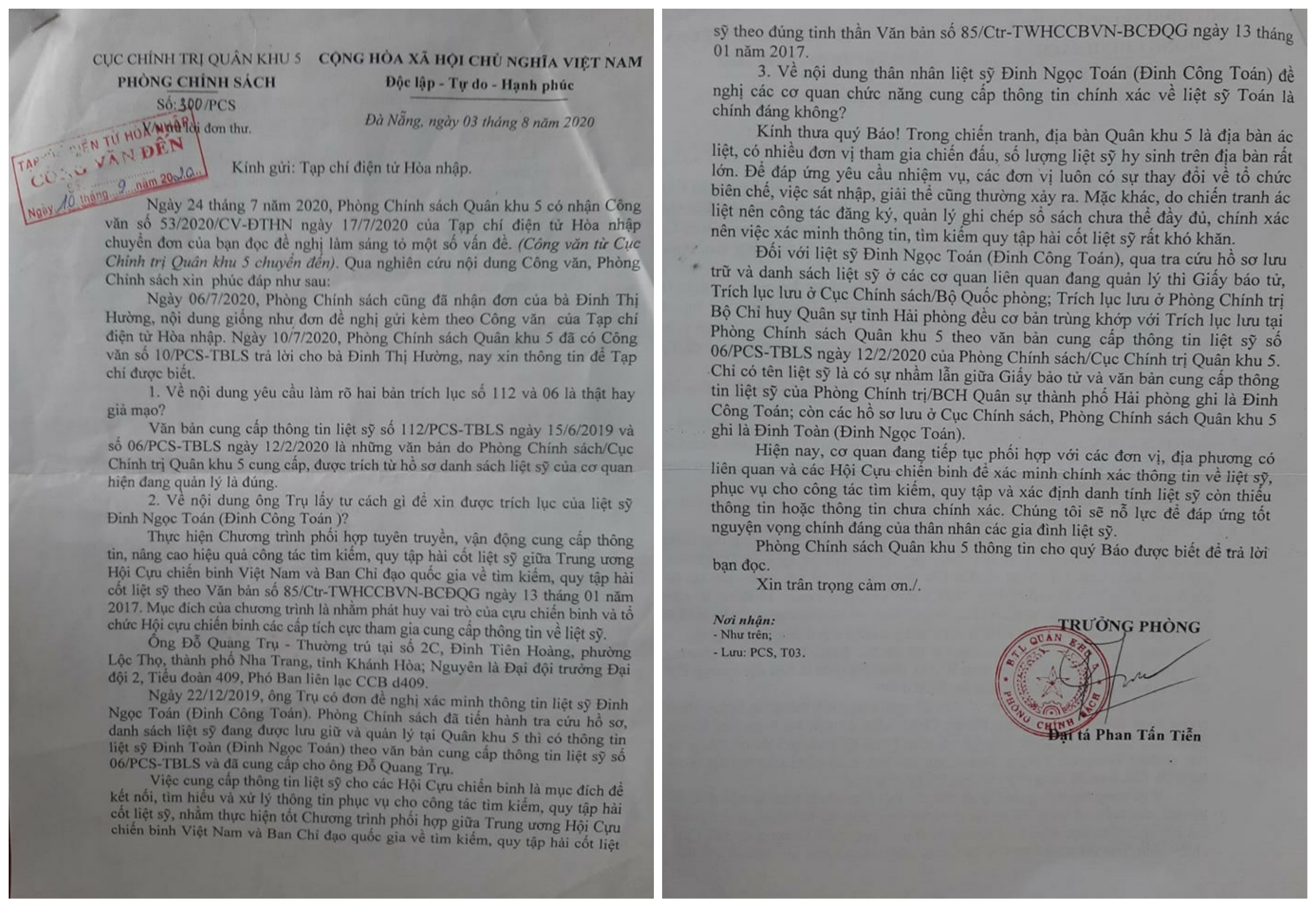 Văn bản cung cấp thông tin liệt sỹ số 112/PCS-TBLS ngày 15/6/2019 và số 06/PCS-TBLS ngày 12/2/2020 là những văn bản do Phòng Chính sách/Cục Chính trị Quân khu 5 cung cấp, được trích từ hồ sơ danh sách liệt sỹ của cơ quan hiện đang quản lý là đúng.