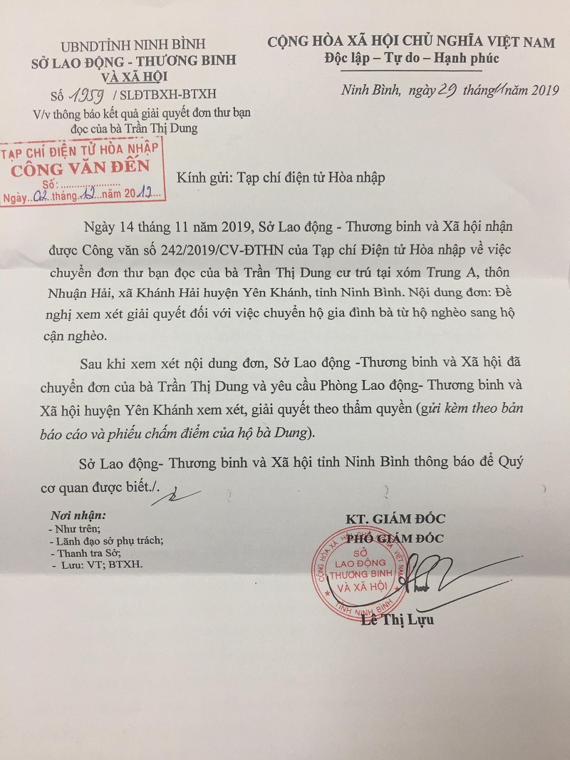 “Thực hiện Công văn số 1905/SLĐTBXH-BTXH ngày 20/11/2019 của Sở Lao động - Thương binh và Xã hội về việc xem xét, trả lời đơn đề nghị của bà Trần Thị Dung xóm Trung A, thôn Nhuận Hải, xã Khánh Hải. Nội dung: Đề nghị xem xét, giải quyết đối với hộ gia đình bà từ hộ nghèo sang hộ cận nghèo (Đơn do Tạp chí điện tử Hòa nhập chuyển về).